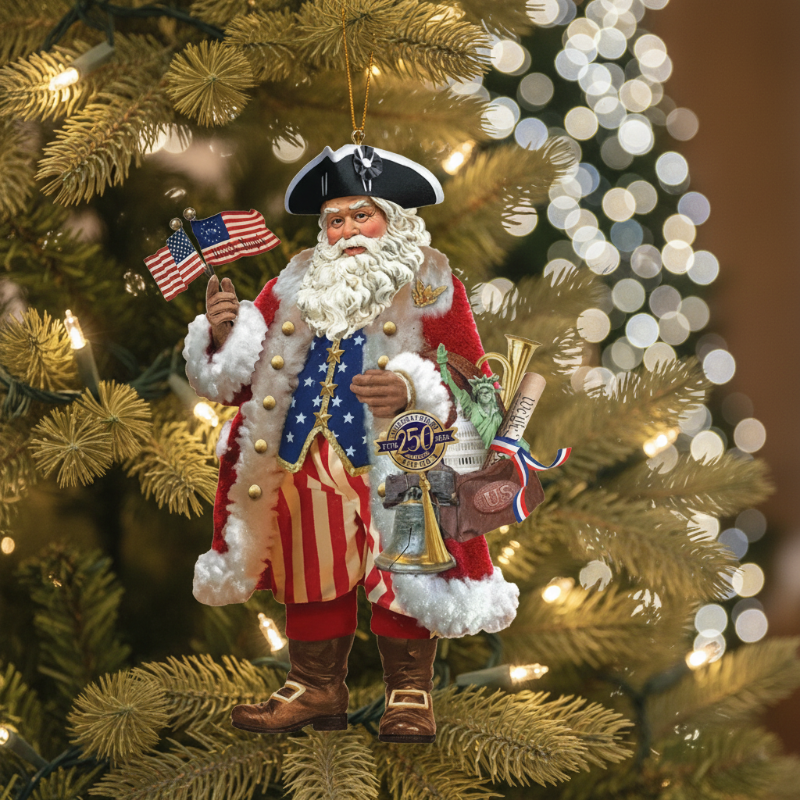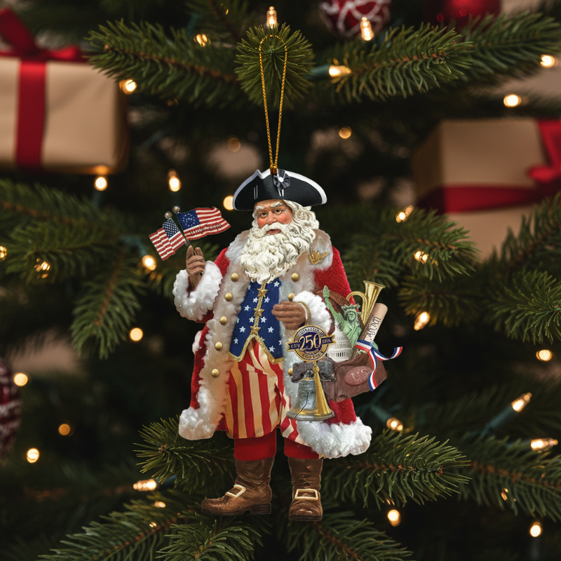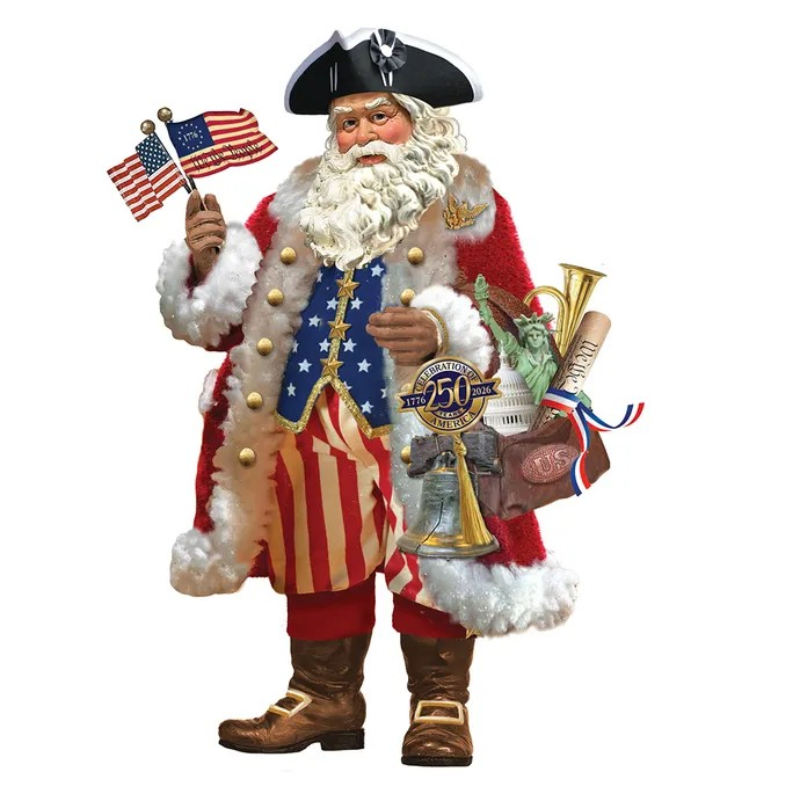 NEW FOR 2026 LIMITED EDITION! Celebrate America’s 250th anniversary with Kurt Adler's 1776 American Santa Ornament, a patriotic twist on a beloved holiday icon. This beautifully crafted, highly detailed ornament features Santa Claus dressed in red, white, and blue, holding symbols of liberty and independence including two flags, the Liberty Bell, a scrolled Constitution, trumpet, the Statue of Liberty and US Capitol building in a mail sack, and lots of gold embellishment and elegant details commemorating the country's founding year. Perfect for honoring this historic milestone, it’s a unique addition to your holiday décor collections or a thoughtful gift for history lovers and patriots. Made of hand-painted poly resin.