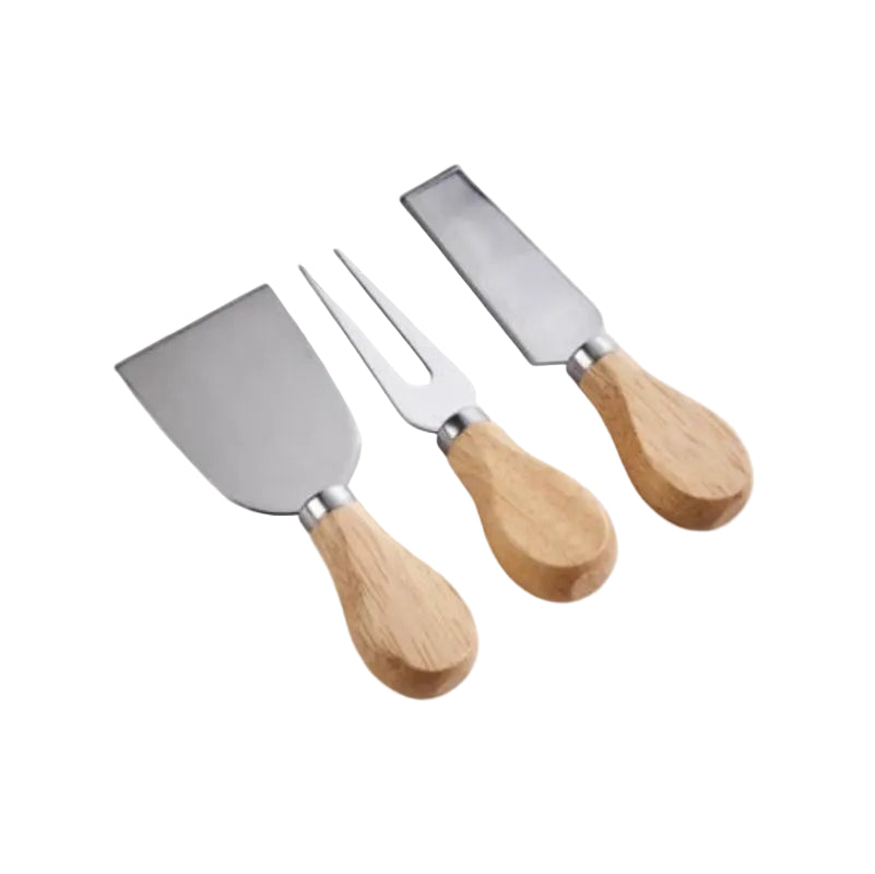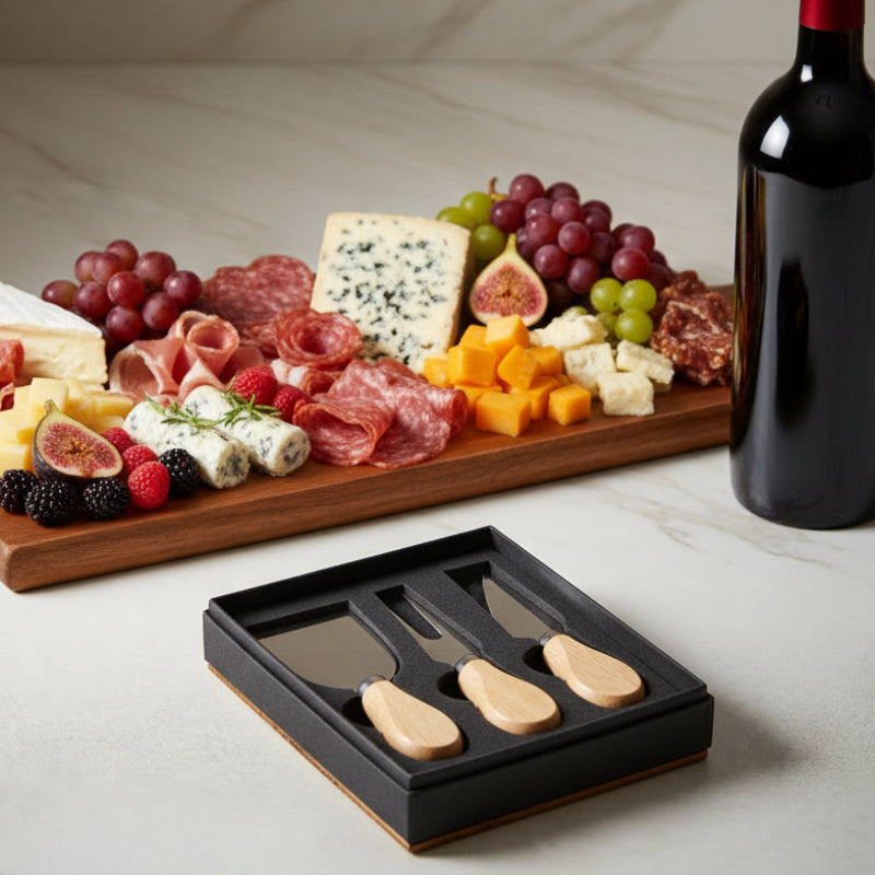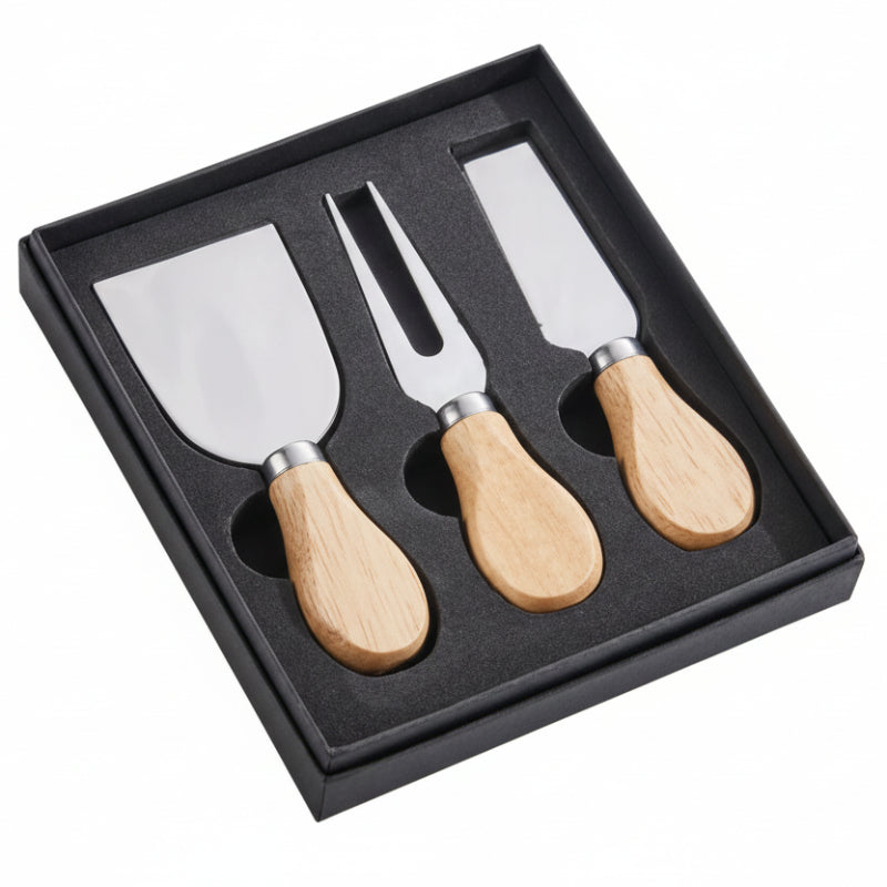 Take your party planning up a notch with this Rubberwood handled serving set with stainless steel blades and hilt for precision cutting and serving, long-lasting beauty, and easy cleanup. Hand wash and dry. Set includes a wide spreader, a cheese fork, and a small spatula, designed to cut and serve different types of cheese from soft Bries to crumbly Fetas. These great additions will complete any charcuterie board whether serving just wine and cheeses or alongside meats, fruits, and specialties, all while looking beautiful. These ship in an elegant black presentation gift box that can also be personalized with a name, date, or monogramming for an additional fee.