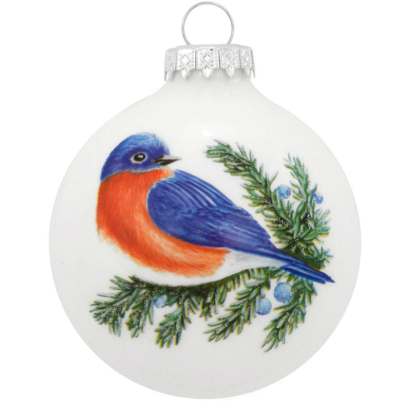 Exclusively crafted for Bronner's in Hungary, this round white enameled decoration features a happy little blue bird perched on a glittering pine branch with the Symbol of the Bluebird printed on the reverse side; associated with happiness, but it also symbolizes transitional effects in our life. For example, when you are about to step into a new chapter of life, the bluebird intervenes and approaches you to signal you that the decisions and steps that you are about to take are going to be a source of happiness for you (keep the bluebirds meaning in your mind). Therefore, the visiting of a bluebird is a good sign, and you should act upon it immediately. Sold individually.