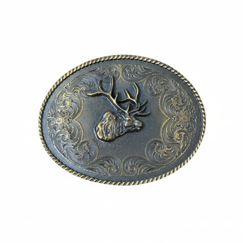 Any outdoor or nature enthusiast will love this gorgeous wardrobe accessory that is brilliant in simplicity in a highly detailed and textured antiqued silver and brass-look finish. In the center, the focal point is a huge 10-point bull that's flanked all sides by flowers, bold swirls and serifs with a twisted rope edge all the way around the entire border. Standard bale on the back.