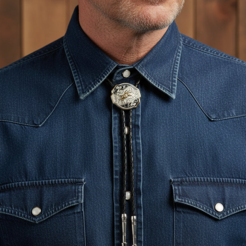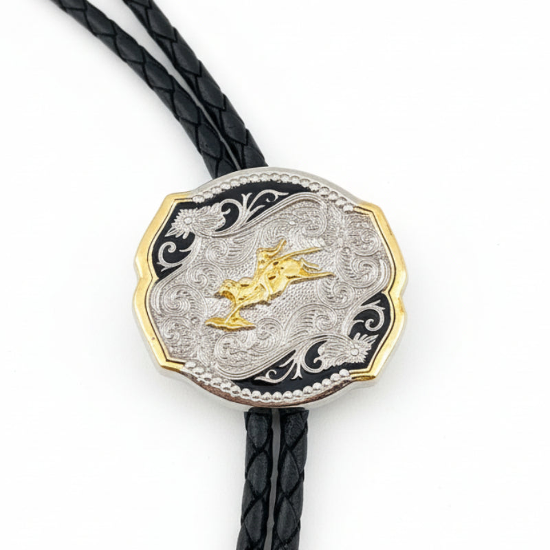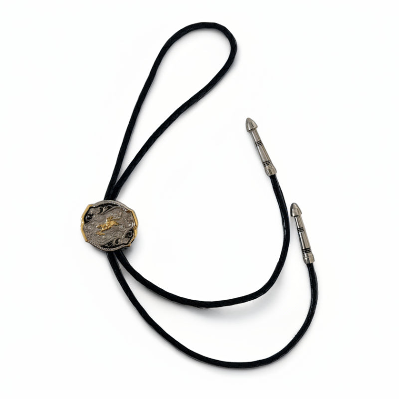 A step above for your dressiest night on the town, the rodeo, or a music concert. An elaborately detailed adjustable medallion style slide with a combo smooth and braided frame with floras, swirls and serif on brilliant silvertone and goldtone featuring a bullrider kicking up the dirt, all accented by a background of black enamel. Comes on a standard 38" black braided cord with weighted tips. One size fits all.