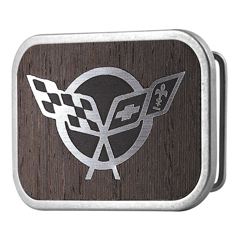 Made in the USA. Officially licensed by GM General Motors that combines fine craftsmanship with legendary performance heritage featuring the iconic emblem set in a stunning marquetry wooden design that offers a rich, elegant contrast of natural wood tones and polished metal. Crafted from durable materials for long-lasting wear and is perfect for any "Vette" enthusiast that values sophistication, quality, and a touch of flair with jeans, casual wear, or just to add a rugged edge to any outfit. Comes with a standard bale on the back that fits belts up to 1.5 inches wide for a perfect fit.