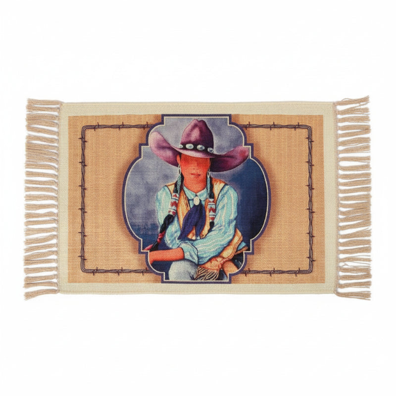 CLOSEOUTS - The theme is blue and denim and this little lady is decked out in her best rustling wear. Inset is printed over a border of barbed wire on a tan rectangle against a natural background. Digitally printed design on durable, soil resistant 100% polyester with knotted tassels. Wipe clean with a damp sponge or cloth. Sold individually.