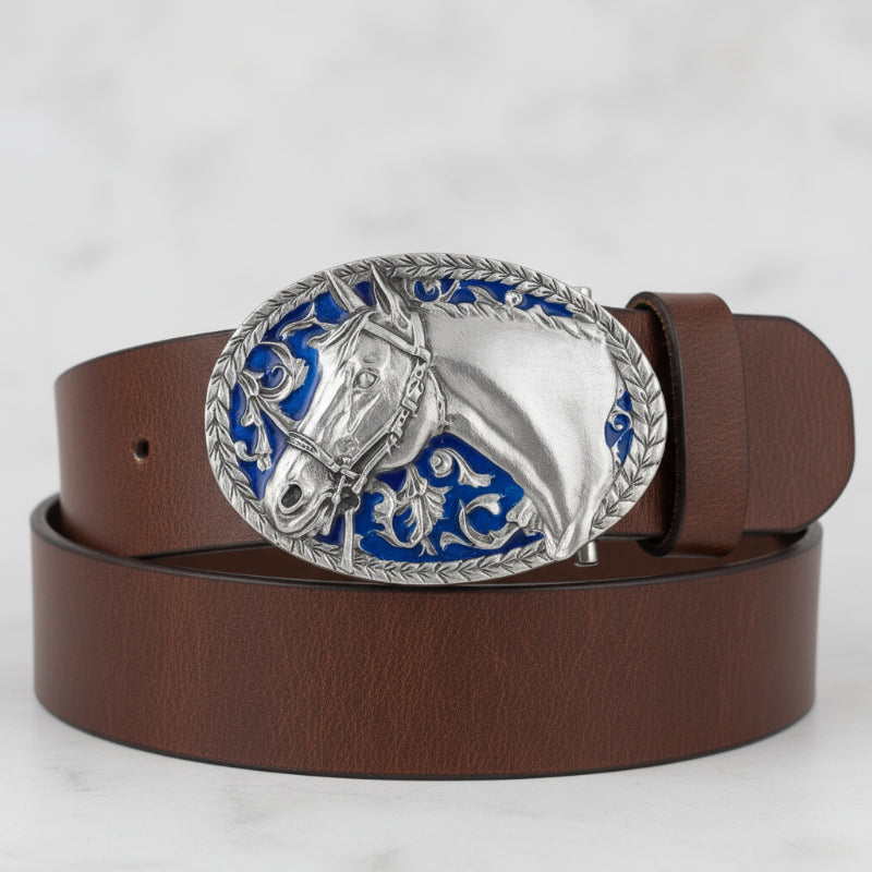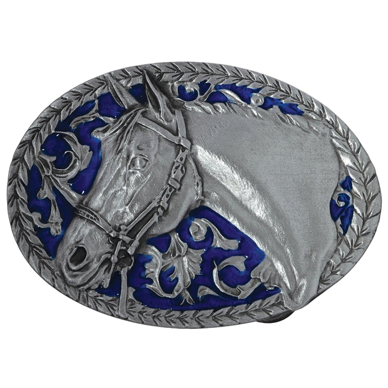 Made in the USA. Features a large full sculpted depiction including very detailed bridle and bit against a beautiful floral scrolled background enclosed in a braided leaf oval in brushed metal finish with a dark blue enamel inlay background. Fits belts up to 2" wide with a standard bale. Solid metal cast, lead-free-zinc aluminum, non-toxic epoxy.