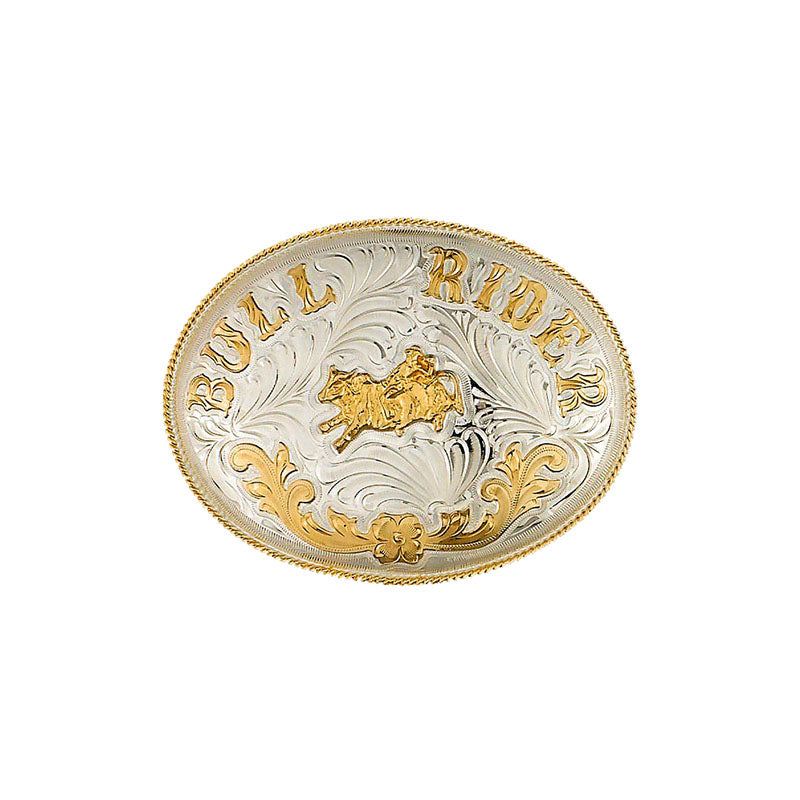 It's the mother of all the coveted "BULL RIDER" trophies that every cowboy wants for bragging rights! It's over-sized in presentation and adorned with a golden finished bull and rider in the center and a title worthy message across the top. It's finished with floral flourishes and scrolling across the bottom on top of a sterling silver, diamond cut background and finally trimmed in a glistening twisted rope edge. Pair it with one of our bolo ties, and collar and boot tips for a winning look on rodeo night. Standard bale fits belts up to 2" wide.