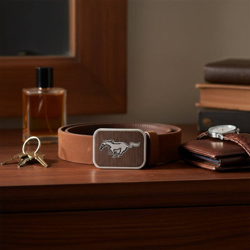Made in the USA. Officially licensed by Ford Motor Company that combines iconic artisanal craftsmanship with legendary performance heritage featuring the iconic pony emblem set in a stunning marquetry wooden design that offers a rich, elegant contrast of natural wood tones and polished silver metallic accents. Crafted from durable materials for long-lasting wear and is perfect for any "Tang" enthusiast that wants to showcase their passion and sophistication that adds a bold elegance and versatile look with jeans, casual wear, or just to add a rugged edge to any outfit. Comes with a standard bale on the back that accommodates belts up to 1.5 inches wide for a perfect fit.