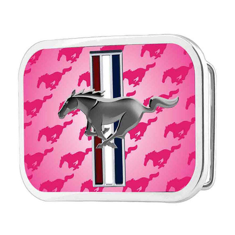Made in the USA. Officially licensed by Ford Motor Company and captures the legendary power and style of America's Muscle Car in a bold, modern design. Features the iconic red, white, and blue pony logo against a bright fluorescent duplication background that delivers both female sophistication and attitude. Crafted from durable metals for long-lasting wear with a polished chrome finish that's perfect for the "Tang" enthusiast that take price in her ride and the look. This bold and versatile look is perfect for jeans, casual wear, and adds a rugged edge to any outfit. Standard bale on the back accommodates belts up to 1.5" W for the perfect fit.