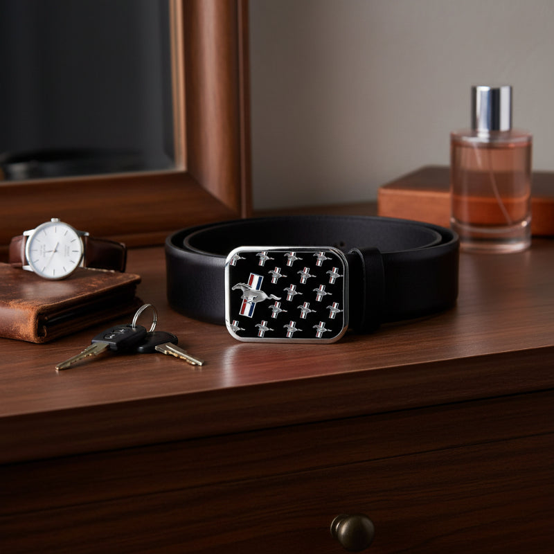Made in the USA. Officially licensed by Ford Motor Company and delivers a bold tribute to the legendary brand's legacy. Combining rugged style with modern automotive flair, it features the classic red, white, and blue logo in an all-over pattern against a sleek background. Made from durable metals and polished finished for long-lasting wear that's perfect for any "Tang" enthusiasts that want to wear their passion with standout style with jeans, casual wear, or to add an edge to any outfit. Had a standard bale on the back to accommodate belts up to 1.5 inches wide for a perfect fit.