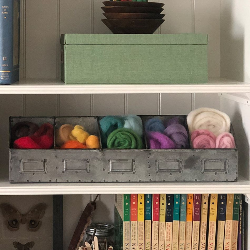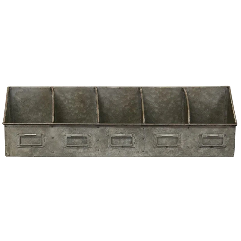 Great for pet supplies, crafting, gardening necessities, kitchen tools, garage organizing, and more. Metal storage box that is split into five equal sections that includes a metal bookplate slotted front for easy labeling and organization. Each section measures 4 inches wide 4.5 inches deep. Made of durable, reinforced aluminum.