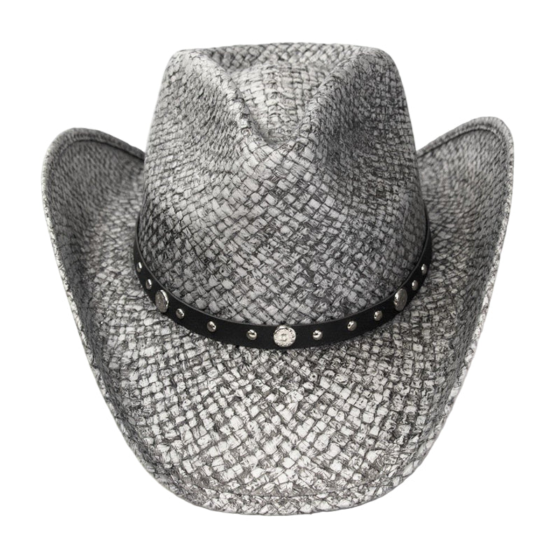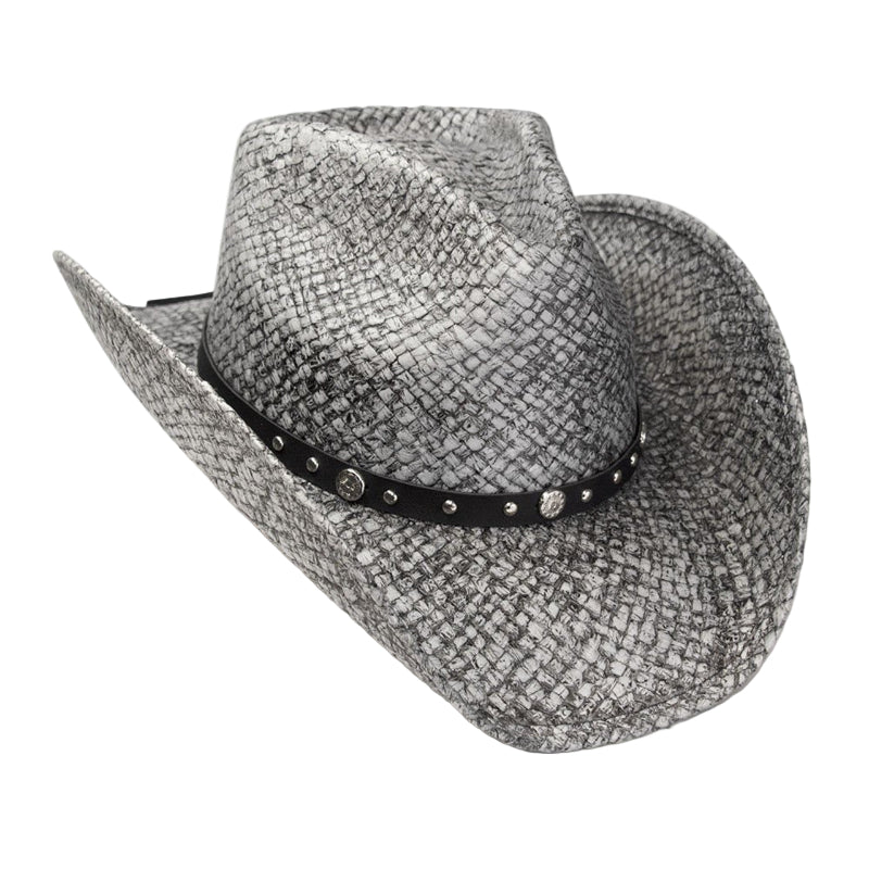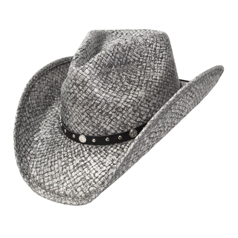 Traditional styling with textured grey mottled rattlesnake skin effects. Tightly woven fibers and comes with a fixed thin black studded hat band, styles may vary from image shown. Has an elastic fits-all band that comfortably stretches to fit a variety of adult sizes. See our easy-to-read sizing chart for the perfect fit. Crown: 4" Pinch Front, Brim: 3.5" Half Taco, Material: real straw, and a sewn-in elastic sweatband. Make your size selection from the drop-down menu.