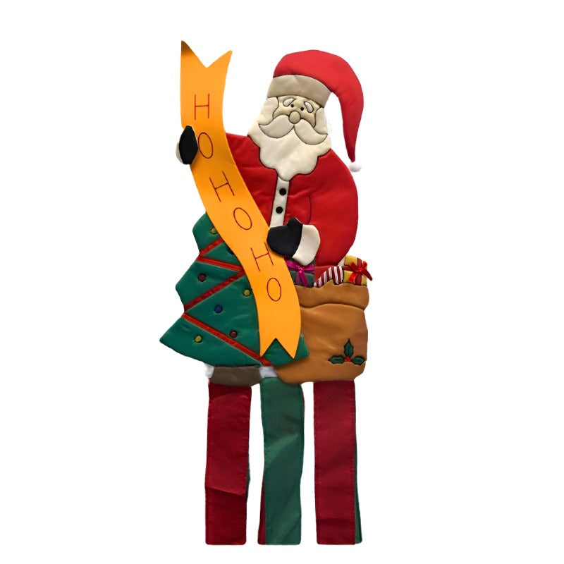 Brightly colored polyester stuffed puffy body with heavy detail stitching depicts Old Saint Nick holding a yellow banner, sack of gifts, and a decorated holiday tree with long streamers of red and green. Secure hanger with spiral, free-spinning ring to avoid tangles and winding. Weatherproof and lightweight. Limited availability!