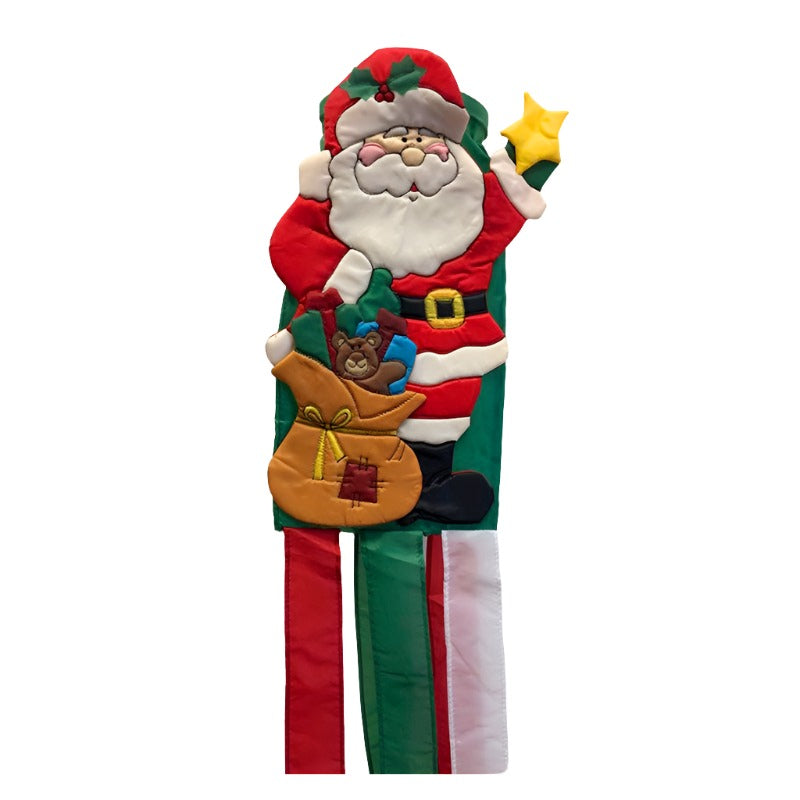 Brightly colored polyester stuffed puffy body with heavy detail stitching depicts Saint Nick holding his bag of gifts and a golden twinkling star with long streamers of red, green, and white. Secure hanger with spiral, free-spinning ring to avoid tangles and winding. Weatherproof and lightweight. Limited availability!