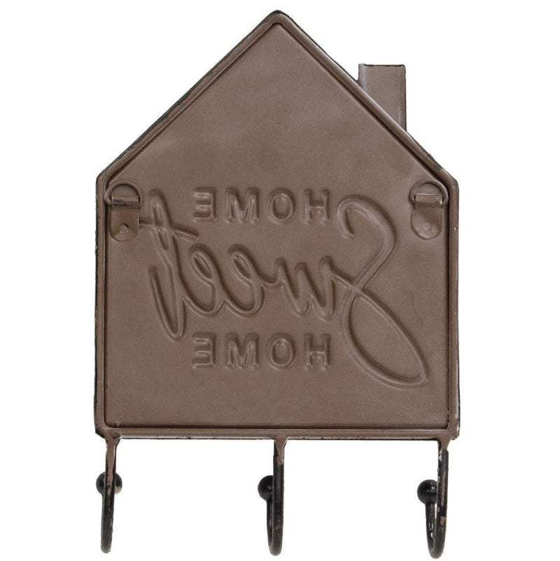 Constructed from distressed lightweight black finished aluminum in the shape of a 5-sided house with a chimney. It's adorned with an inviting message in white lettering and has three attached hooks with rounded ball ends for jackets, scarves, leashes, keys, and more in a modern farmhouse theme that includes two D-ring hangers on the back for easy installation to any flat vertical surface.