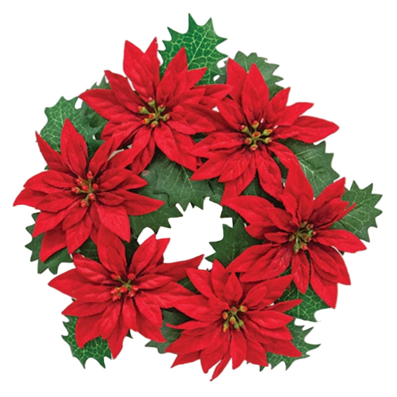 NEW FOR 2025! Brings a classy Christmas accent to any centerpiece display, shelf or tabletop. A sturdy green plastic ring sprouts green branches to form the base with vibrant red dimensional fabric poinsettias with fully-veined petals and colorful plastic centers to give them a realistic look. Designed for use with pillar candles 2.5-3 inches in diameter, not included. Sold each.