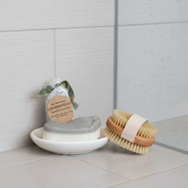 Made in the USA. A creamy combination of refreshing scents and gentle pumice to smooth rough heels and calluses, with goat's milk for softness and fresh, clean feet with every use. Gentle fragrance oil added that's safe for skin. Use it with our foot butter, sold separately, for a daily treat your tootsies will love. 4 oz. bar. Ships labeled in a clear Cellophane gift back with a matching bow.