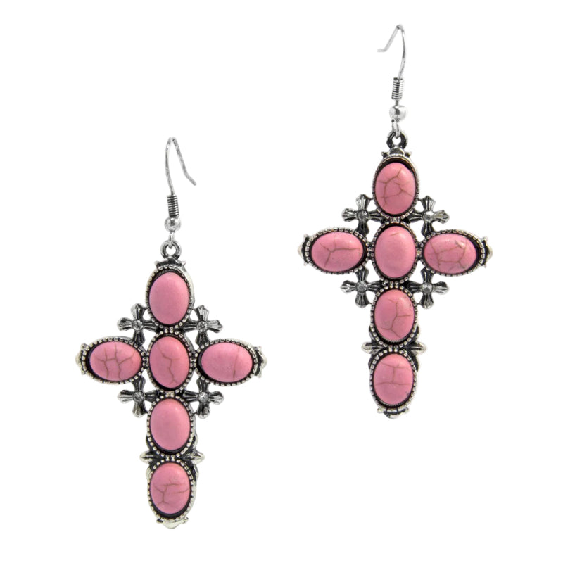 Bring bold and colorful charm to your favorite outfits with these silvertone filigree motif crosses with engraved details vibrant faux bubble rose-colored stones that delivers a striking mix of rustic with religion with fishhook wires. Get the high-end look without the expensive price tag! Lightweight and comfortable with for all day and night wear for the rodeo, a night on the town or Sunday morning services.