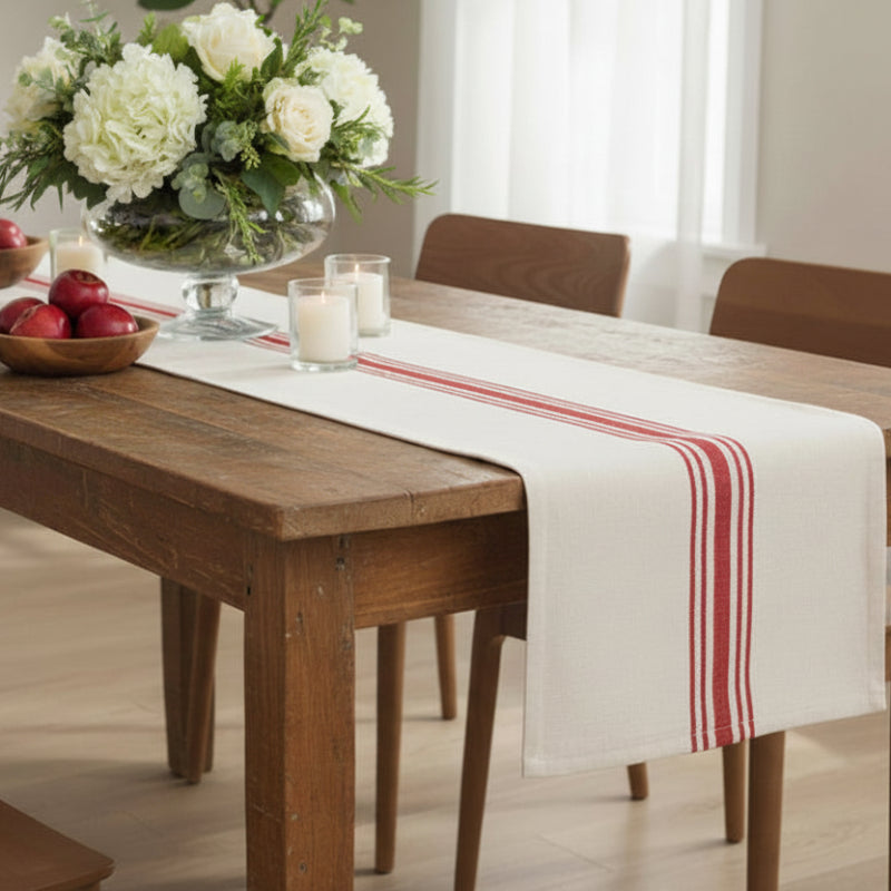 Features a thick, bright crimson stripe down the center with two thinner stripes accenting each side. Protects fine surfaces from heat and scratches from seasoning shakers, butter dishes, and other kitchen and dining accessories. Adds visual contrast and interest to your home's decor style and a great home for any table centerpiece. See also our longer and shorter versions, sold separately. Made of 100% cotton, machine washable, cool iron.