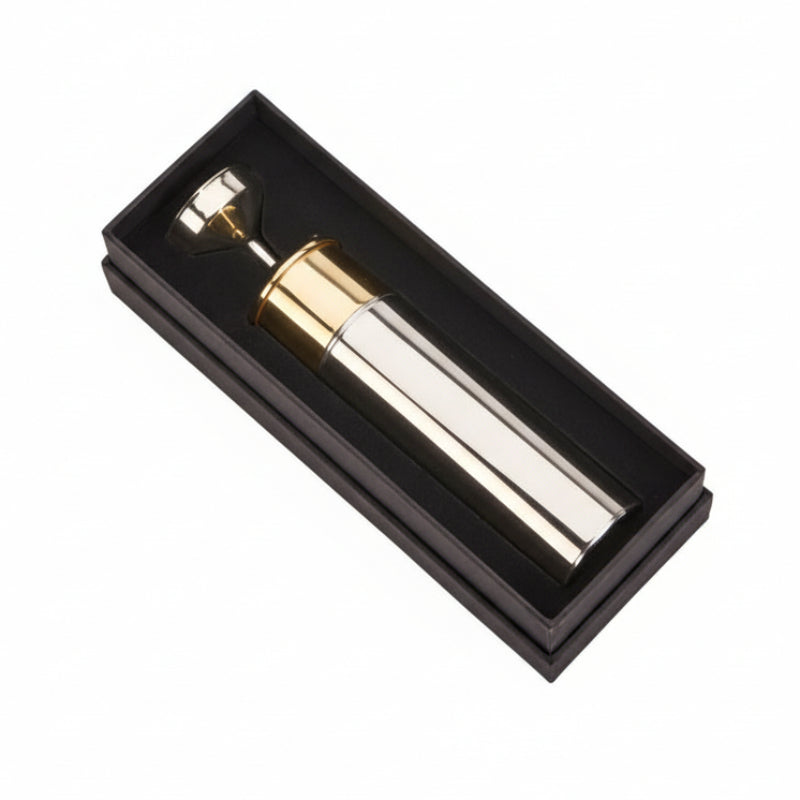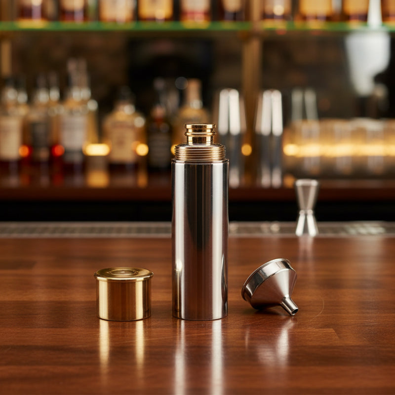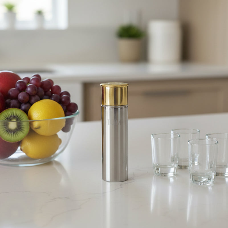 This unique beverage container resembles a tall, larger-than-life shotshell. But open the gold-toned top and find the screw-off lid of the flask that holds up to 3 ounces of preferred imbibement. Each one is constructed of heavy-duty stainless steel, known for its durability, and is sure to last a lifetime. Care: It is advised to hand wash the flask with soapy warm water and air dry each part. Do not put in the dishwasher as the heat can cause issues with the design and materials. Makes a great gift for that special hunter, fisherman or gun enthusiast in your life a one-of-a-kind gift for his or her birthday, Christmas, Father's Day, Anniversary and more. Ships in a black velvet lined gift box. Can be personalized with a date, name, or monogrammed for an additional fee.