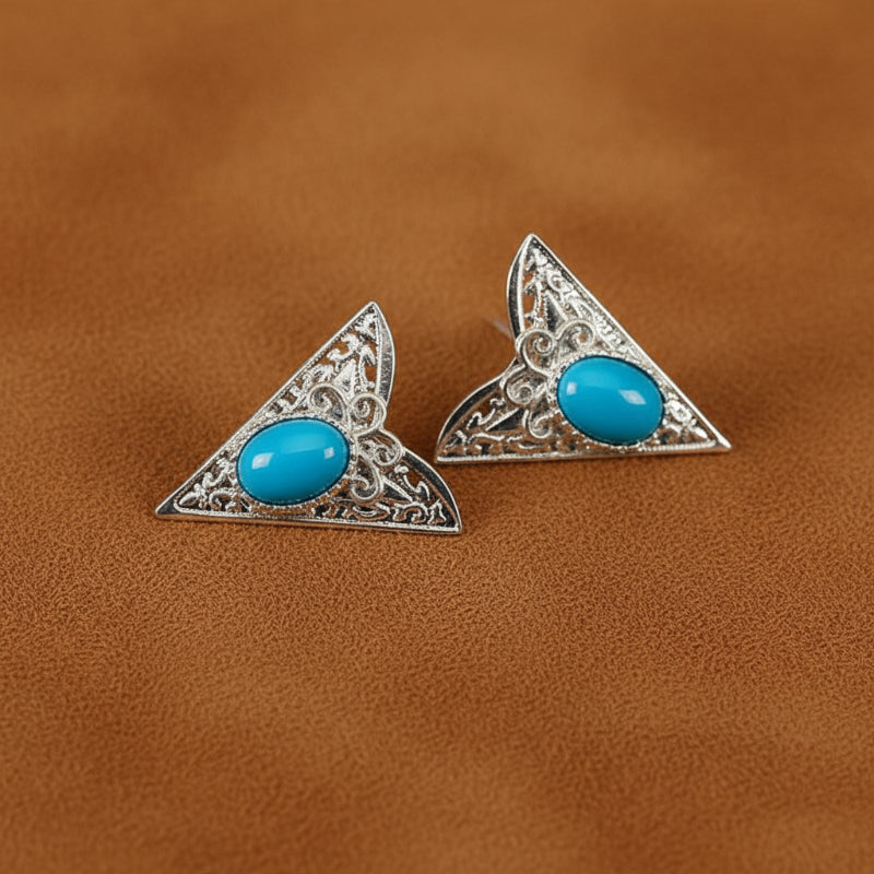 Made in the USA. Brilliant silvertone filigreed design with large oval simulated aqua blue stones. Slip these right over the tips of your points and tighten down the flat disc on the back, no pins, no holes. Easy removal. Sold only as a pair as shown. See also our black onyx version, Item #CT-1058, sold separately.