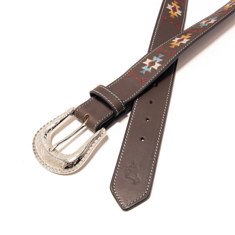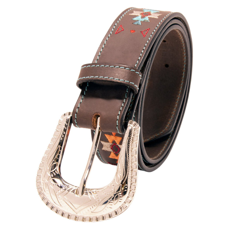 Showcases traditionally inspired, intricate and brilliantly colored Aztec stitching across the center back that adds a subtle texture and colorful interest to the classic cowboy or cowgirl styling as well as contrasting, single stitching along the edges that adds strength and durability to the life of the item itself. Crafted from durable, high quality materials offering a smooth milk chocolate finish with eye-catching detailing that's perfect for everyday jeans or for a dressy night on the town. This one has a timeless style and character. Has a high finish silvertone removable buckle with etched geometric patterns and the classic pony stamped at the end. Finishes include: 1-1/2 inches wide and 1" between holes. Choose your size from the drop-down menu.