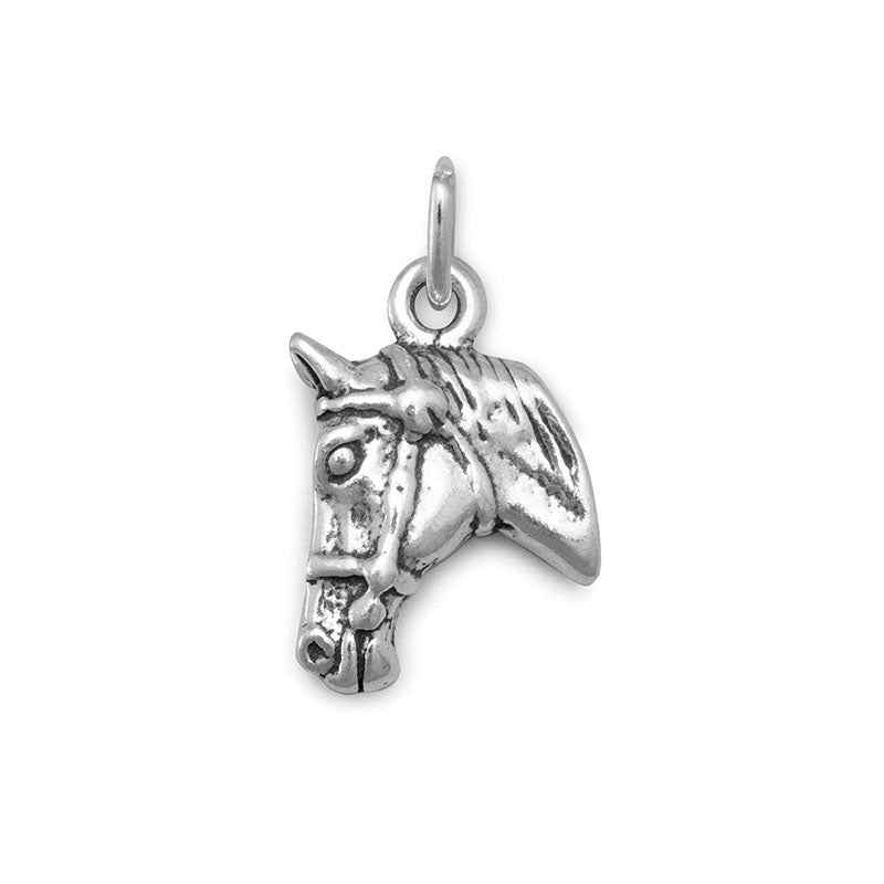 Made in the USA. Intricately detailed oxidized 2D side profile of a horse's head with large bale and O-ring for easy addition to any necklace or bracelet, sold separately. .925 Sterling Silver