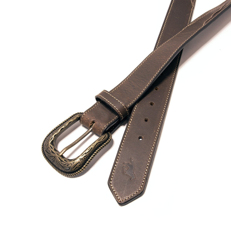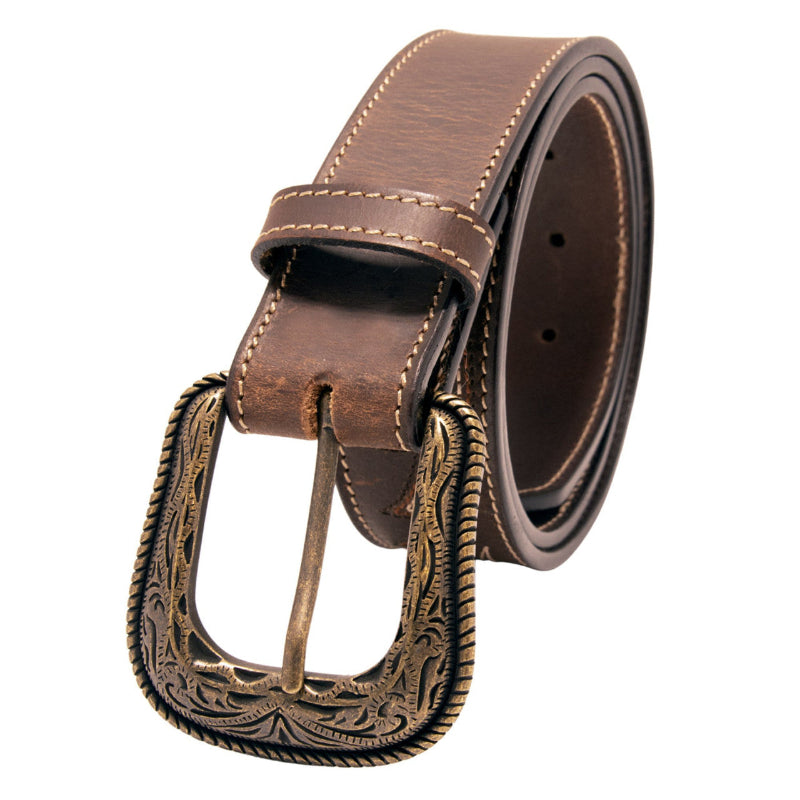 Features a stylish contrasting stitching across the center back that adds a subtle texture and interest to the classic cowboy or cowgirl styling as well as single stitching along the edges in the same thread color that adds strength and durability to the life of the item itself. Crafted from durable, high quality materials offering a sleek milk chocolate finish with eye-catching detailing that's perfect for everyday jeans or for a dressy night on the town. This one has a timeless, rugged character. Has a high finish rope-edged goldtone removable buckle with etched swirls and serifs and the classic pony stamped at the end. Finishes include: 1-1/2 inches wide and 1" between holes. Choose your size from the drop-down menu.