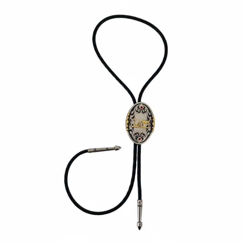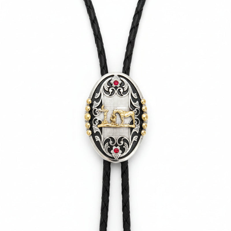 Wear it proudly to symbolize your Christian belief, humility, and devotion symbolizing redemption, sacrifice, strength in faith, and the spiritual side of the "cowboy way of life." The adjustable medallion depicts a goldtone cowboy with his horse in tow kneeling at the cross along the dusty trail against a textured silvertone background surrounded by swirls and serifs, accented by two ruby red stones, one at the top and bottom, all set in black enamel. Comes on a standard 38" braided leatherette cord with weighted tips. One size fits all.