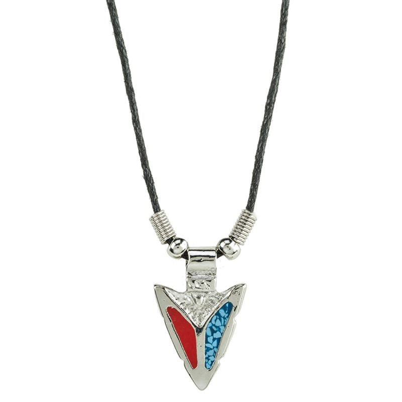 A brilliantly shiny arrow shaped pendant holds brightly colored red coral and turquoise filled enamel in a roughly textured 3D shaped pendant on a black leatherette cord with gleaming silver accents. Clasp closure. Lead and nickel free.