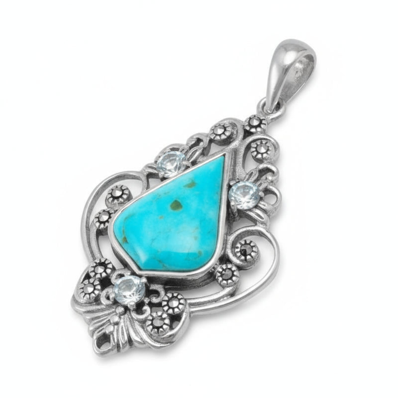Ornate .925 sterling silver and reconstituted turquoise with a large, sleek bale to accommodate thicker, heavier necklace chains, not included. The center stone measures approximately 12.5mm (1/2") x 16mm (5/8"), with three 3mm blue topaz and 10 marcasite accents. See our matching earrings, Item #65449, sold separately.