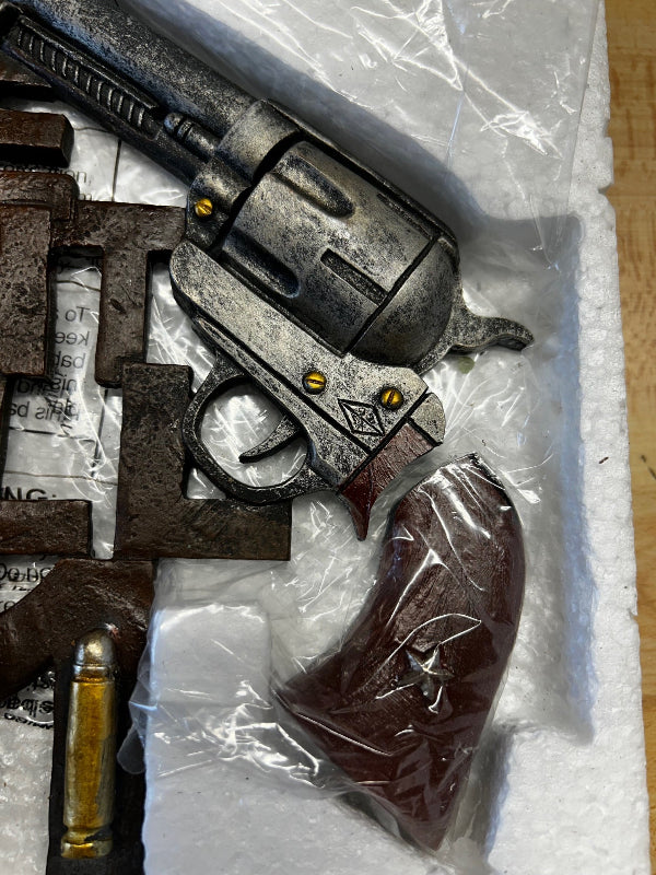SCRATCH & DENT SALE! Inside or outside, it's a statement to attest to your Constitutional rights and the 2nd Amendment! Made of hand painted poly resin with realistic details and metallic finishes for authenticity. Two revolvers are crossed at the barrels to frame out the faux rustic steel cut-out lettering that also includes brass cartridge accents. Hangers on the back for easy hanging on any flat surface with screws or nails, not included.