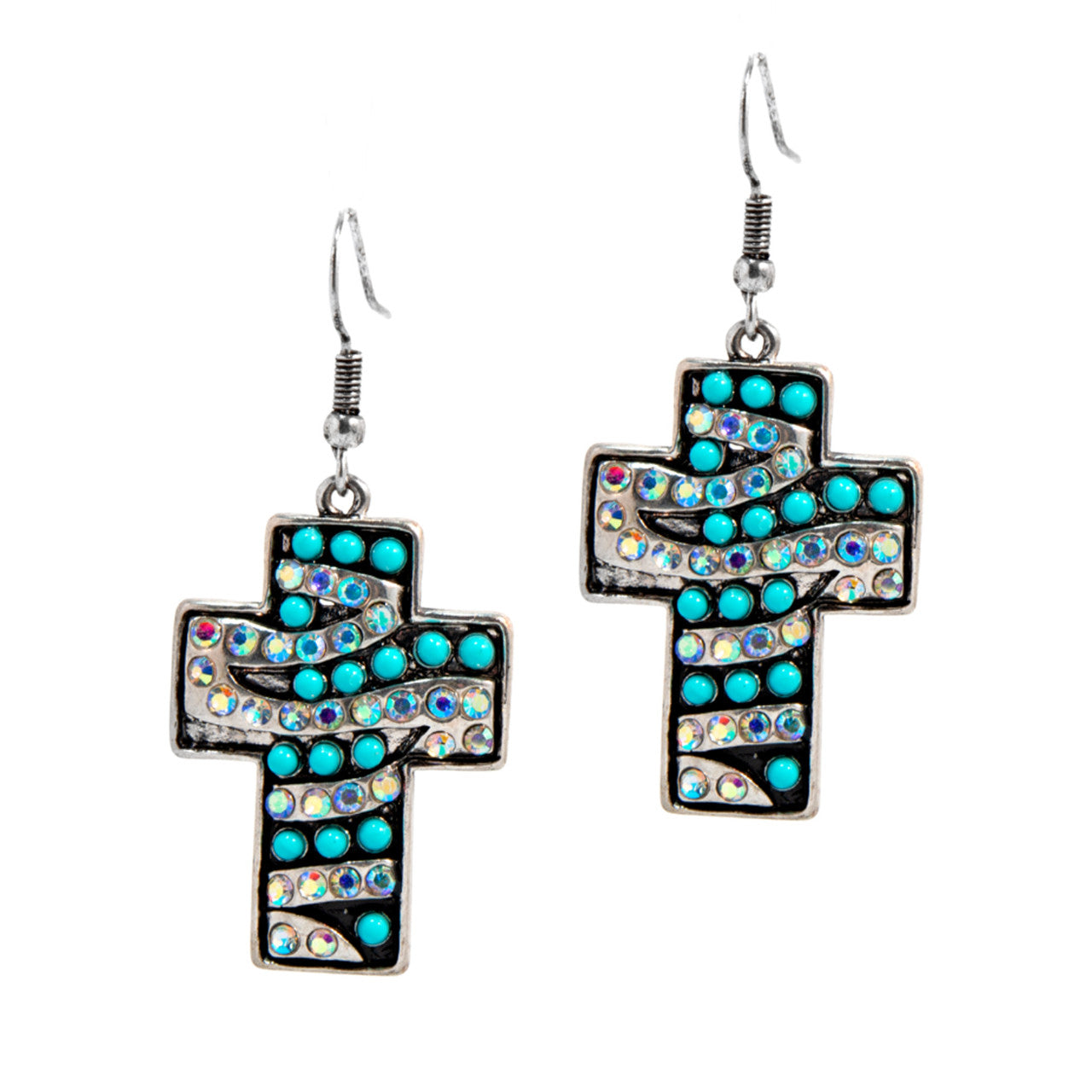 Adds a bold Southwestern sparkle to finish your wardrobe look! Striking crosses filled with alternating faux blue beads accented with 30 shimmering iridescent rhinestones to deliver a vibrant, eye-catching cowgirl style. The unique layout pattern will make these a favorite go-to for any outfit, day or night, for rodeos, concerts, and everyday wear. Silvertone setting and fishhook wires make these easy on, easy off comfort with great dangling movement.