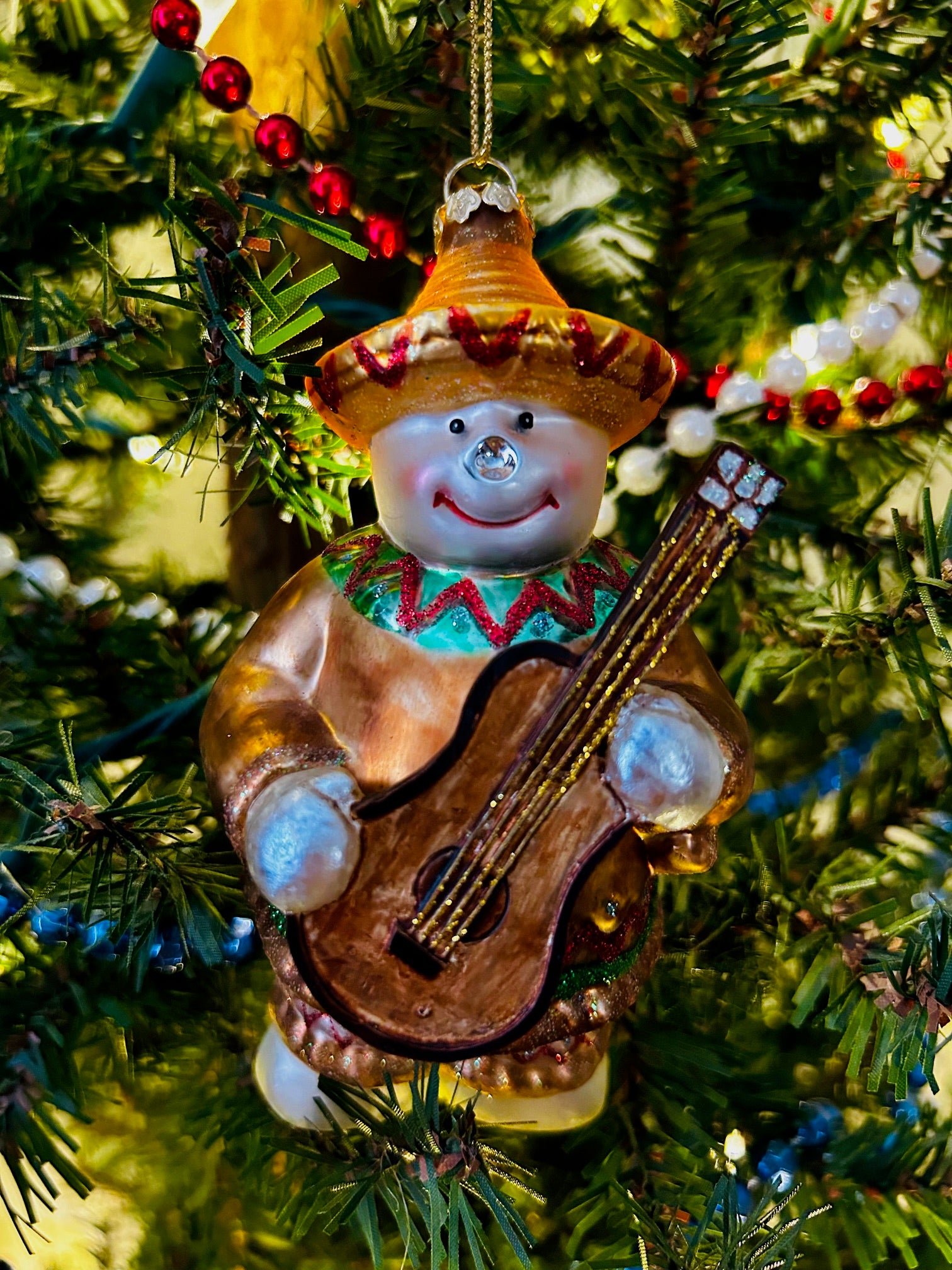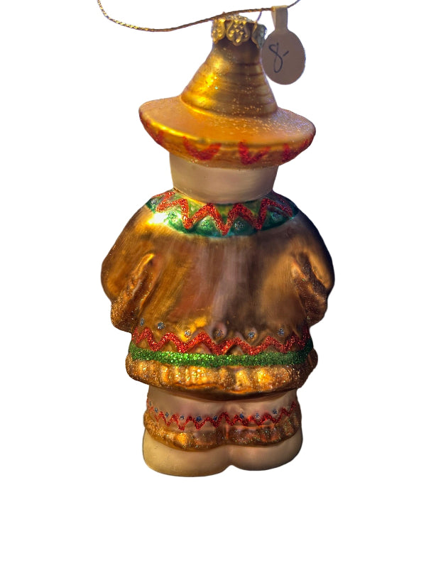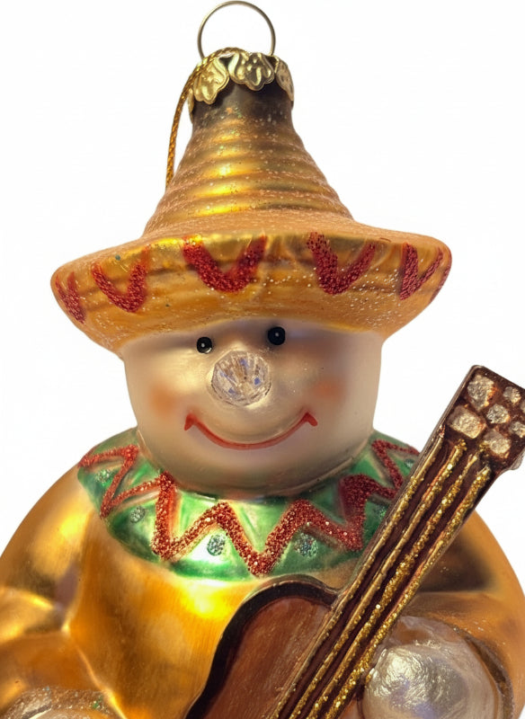 ONE-OF-A-KIND! There's a story behind this colorful character. Years ago, we owned a Christmas store in the beautiful town of Cody, Wyoming. When we took over the store that included inventory, there were many one-of-a-kind items including ornaments. This guy was on one of the 50+ decorated trees in the store and one day, we noticed his nose was missing. We put him behind the counter, hoping that one day, we would find the nose and reattach it. When the store closed in 2009, he was put into storage with many other "orphaned" items and slowly, we have photographed and added those items to our website. He's glass and highly decorated much in the style of Bronner's but we could not find any information on him online, nor could we find his item number, UPC code, or any images of what his nose would have looked like. The last photo shows him without his nose. There are not any trademarks or maker's marks, numbers, or artist signatures anywhere on him. He's being sold "as-is" and has his original price tag of $8.00. His nose was replaced with a clear Swarovski crystal bead that glistens like a snowball and adorns his sweet smiling face. Comes with a golden braided hanger. He needs a new loving home!