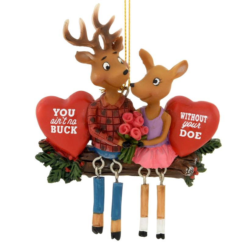 Hand painted poly resin with sparkly glazes, adorable dangling legs, and the sentiments on two red hearts, "YOU ain't no BUCK WITHOUT your DOE." This charming decoration comes ready to hang on your holiday Christmas tree with a golden braided cord. Sold individually.