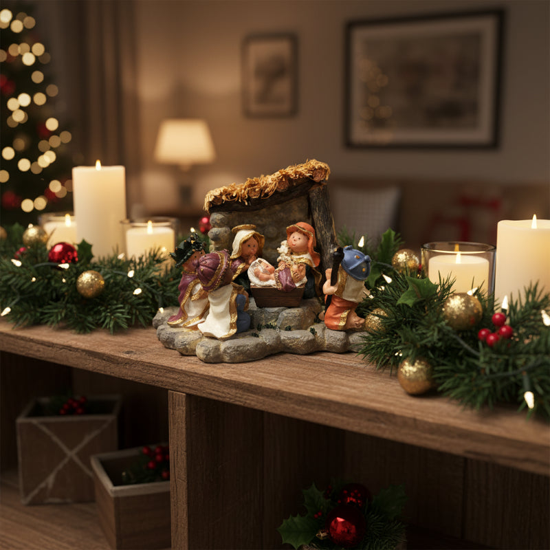 The perfect set for a child's first Christmas. Colorful painted poly resin multi-cultural nativity figurines positioned on a stone-look poly resin manger base with real straw accents. Set includes: Baby Jesus, Mary, Joseph, and the Three Wise Men. Not a toy and not intended for children under 3 years of age without adult supervision.