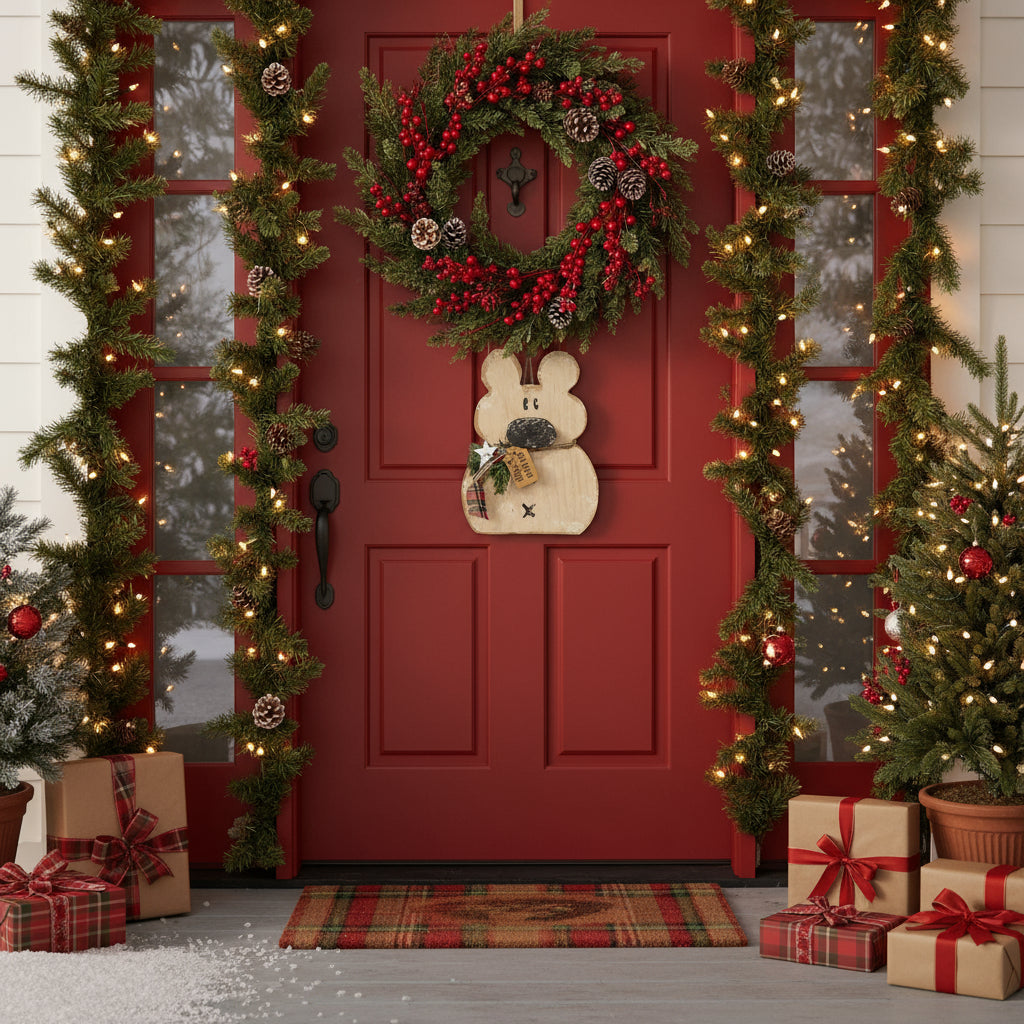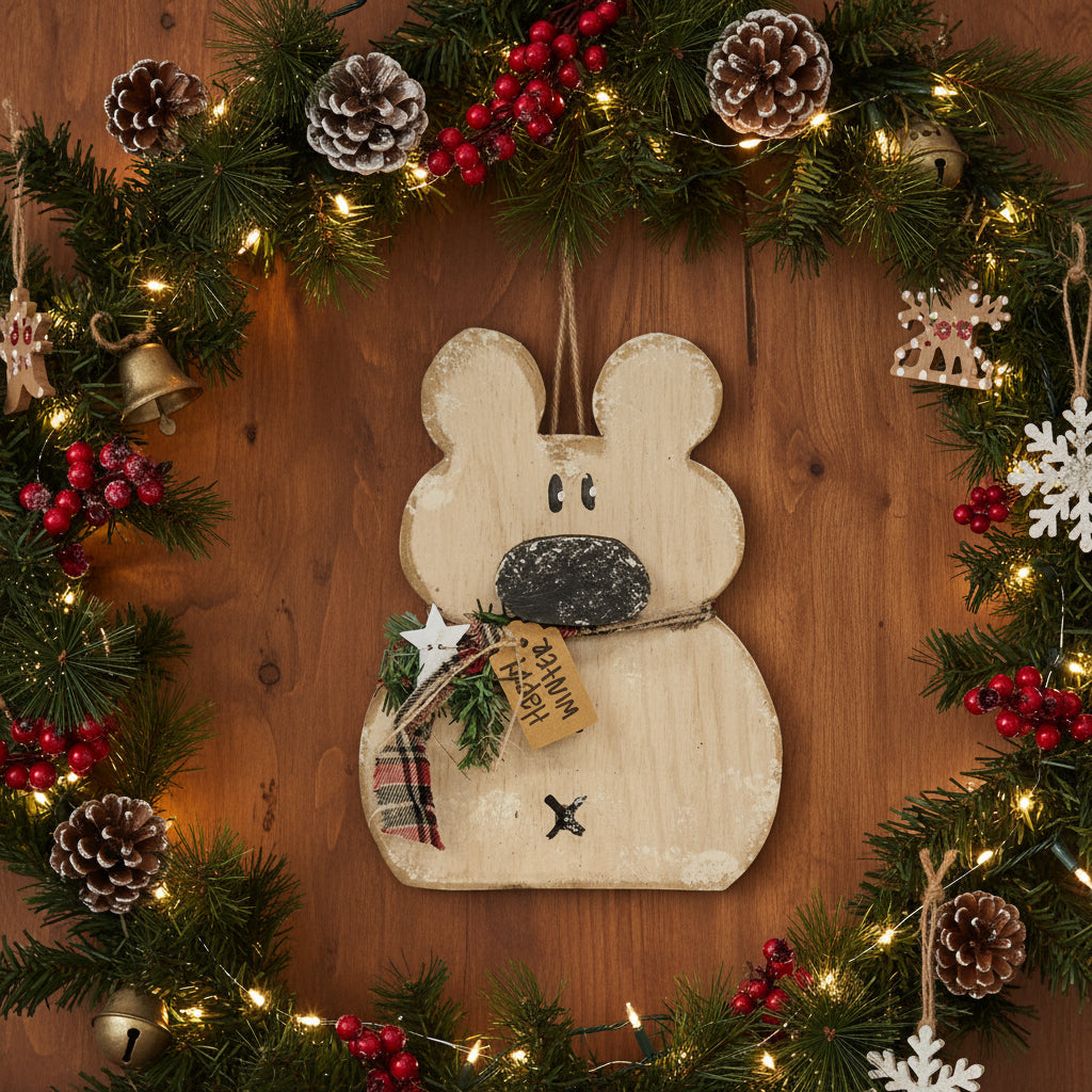 Made in the USA. Designed to be hung on any vertical flat surface. Carved from solid, lightweight woods in a layered design to give it dimension and the edges are distressed. Depicts a wide-eyed cream-colored cub with rounded ears and curious painted eyes and a burlap beige and red plaid scarf accented by a spring of faux greenery, a cutout white star, dusted with snowflake effects, and a brown paper tag that reads, "Happy Winter." Comes with a jute hanger attached on the back for easy display on a door or wall.