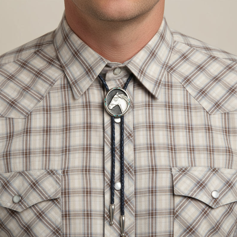 Features a finely detailed horse's head set in a satin black nickel finish, offering a sleek take on traditional western style. Comes on a 36" sturdy braided black leather cord with 1" nickel plated zinc alloy tips. It's perfect for any equestrian lover, rodeo fans, or any enthusiast looking to add a timeless yet bold statement piece to any casual or dressy outfit with cowboy or cowgirl style. Made of die cast zinc alloy, gilt plated.