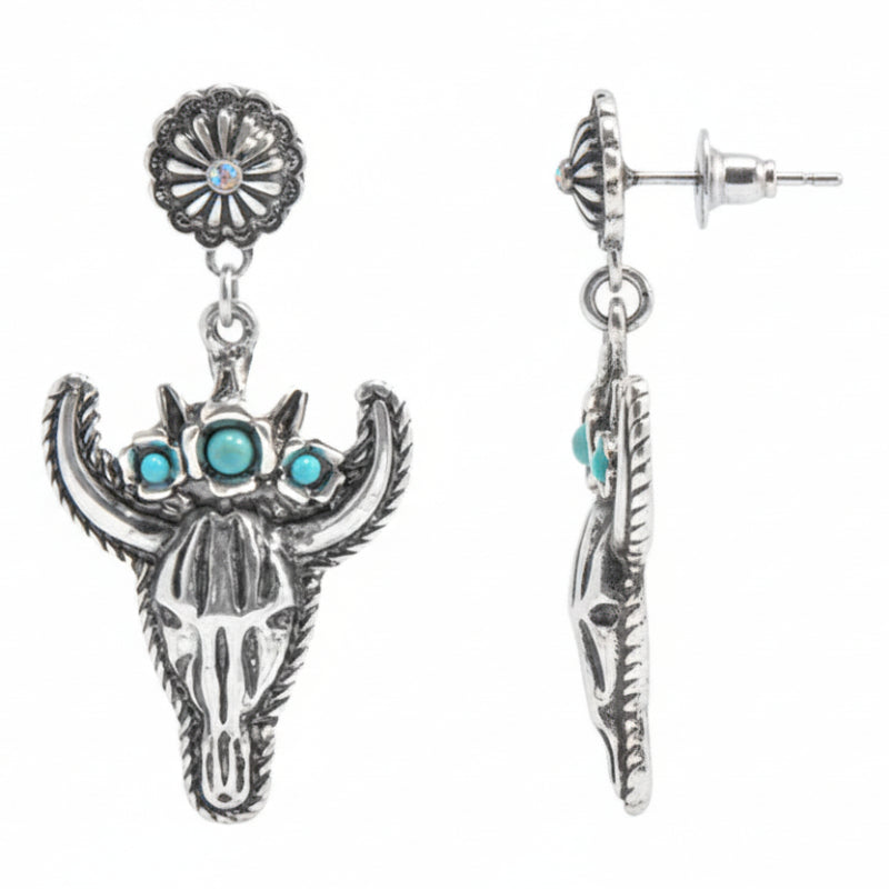 Bring a bold look and add a touch of the Southwest to your favorite cowgirl outfits with these western-themed baubles featuring a silvertone rope-edged housing with engraved details and three vibrant faux aqua-colored stones in the forehead with basic studs in the iridescent rhinestone studded concho and light-catching horned dangling bottoms. Get the high-end look without the expensive price tag! Lightweight and comfortable with for all day and night wear for the rodeo, a night on the town or Sunday morning services.