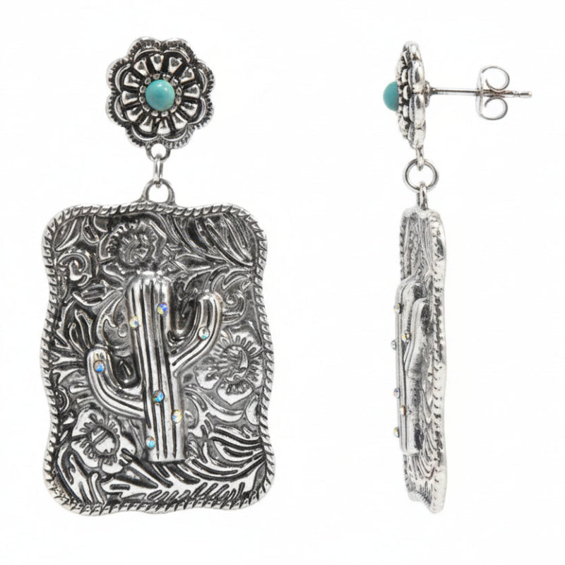 Show off your Southwester spirit with these silvertone framed ornate cacti featuring details florals in a braided rope border with smaller, round flower studs with a center blue faux stone that add a pop of color to capture the classic cowgirl style. Classic studded backs for easy on/off and lightweight for all day and night wear that move gently. These are perfect for all your outfits, a night on the town, country concerts, or everyday wear.