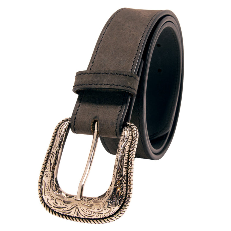 Features a bold double-barb, two-row design across the center back that adds texture and interest to the classic cowboy or cowgirl styling as well as single stitching along the edges that adds strength and durability to the life of the item itself. Crafted from durable, high quality materials offering a sleek ebony finish with eye-catching detailing that's perfect for everyday jeans or for a dressy night on the town. This one has a timeless, rugged sophistication. Has a high finish rope-edged silvertone removable buckle with etched swirls and serifs and the classic pony stamped at the end. Finishes include: 1-1/2 inches wide and 1" between holes. Choose your size from the drop-down menu.