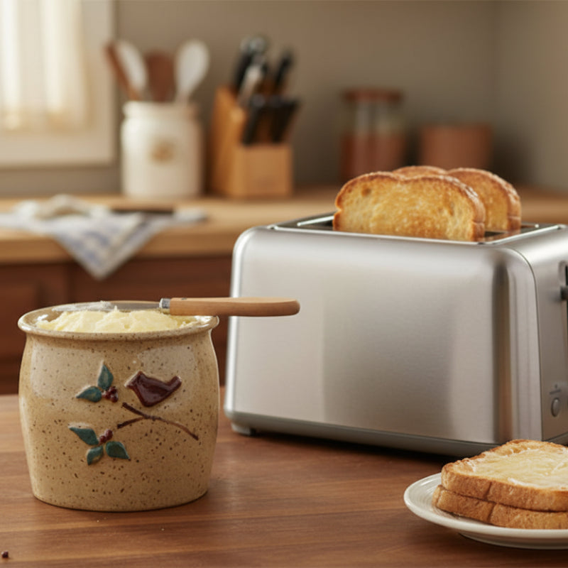 Made in the USA. Versatile pottery container that's perfect for small kitchen necessities, cold butter, syrups, or dressings. Features a dark beige finish with brown flacks for a textured look and embossed and painted design that depicts a single red bird landing on a branch with green leaves and holly berries. Finished in a glossy glaze finish for easy cleaning. Not oven, stovetop, or microwave safe. Hand wash recommended.