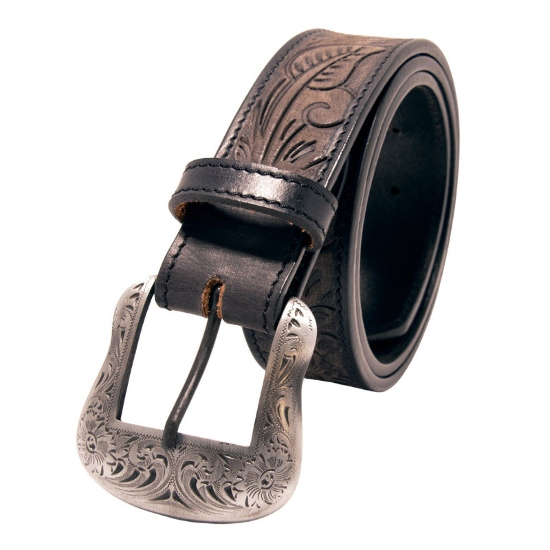 Features intricate floral tooling that adds a touch of elegance and character to the classic cowboy or cowgirl styling as well as single stitching that adds strength and durability to the life of the item itself. Crafted from durable, high quality materials offering a polished edge with an ebony background highlighted by dark brown details. It's perfect for everyday jeans or for a dressy night on the town. Has a high finish silvertone removable buckle with a etched florals accented by swirls and serifs. Finishes include: detailed carved patterns, 1-1/2 inches wide and 1" between holes. Choose your size from the drop-down menu.