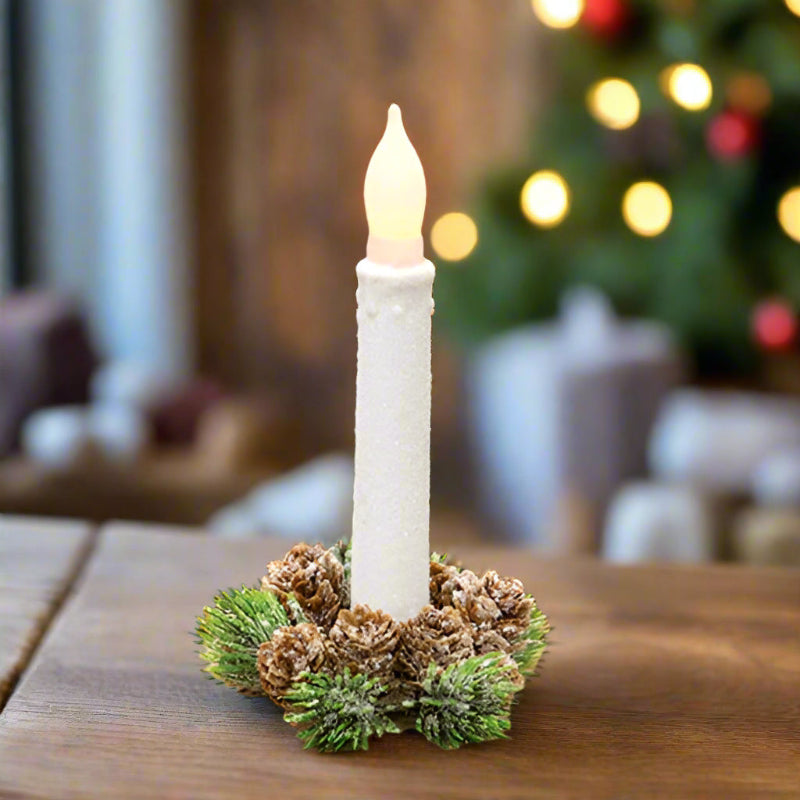 NEW FOR 2025! Bring a little snow indoors with our nature inspired glistening needles that's perfect for placing around your favorite taper candles, not included. The base is a green plastic base with spiky bristles and tiny pine cone accents. Heavy white flocking and iridescent glitter coats the entire thing for a frozen look. Sold each.