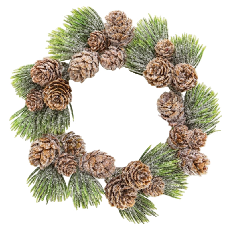 NEW FOR 2025! Bring a little snow indoors with our nature inspired glistening needles that's perfect for placing around your favorite 2-3 inch pillar candles, not included. The base is a green plastic base with spiky bristles and tiny pine cone accents. Heavy white flocking and iridescent glitter coats the entire thing for a frozen look. Sold each.