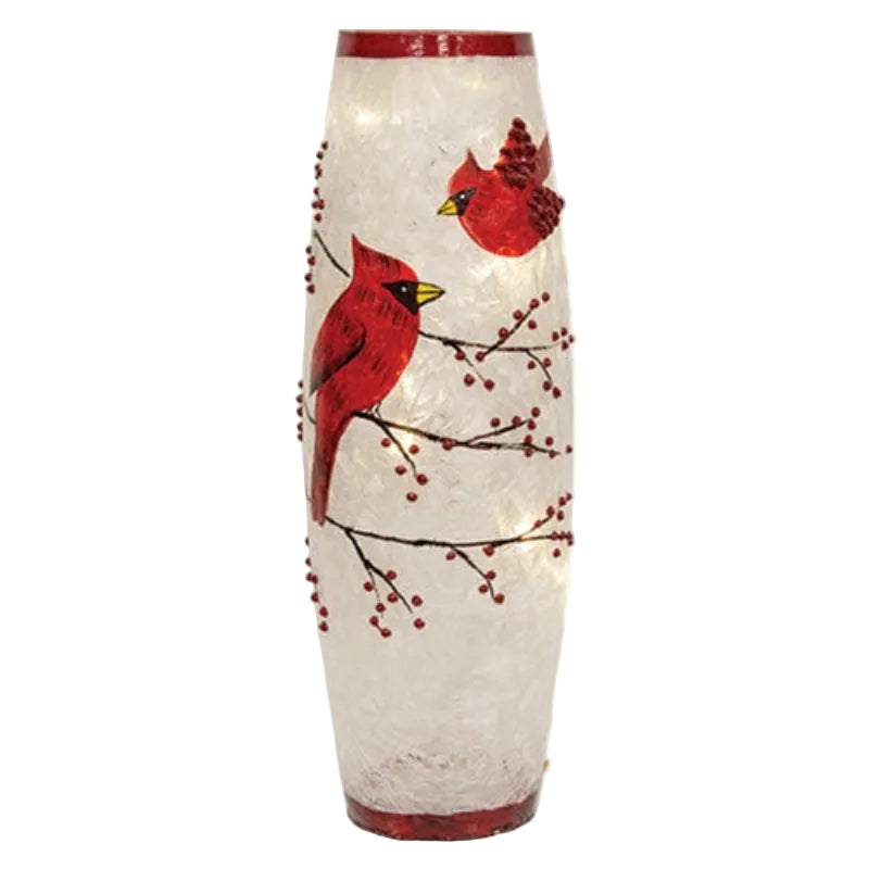 An eye-catching illuminated decorative piece that perfect for year-round or the wintery holidays. Crafted from frosted, crackled glass that holds a string of 10 mini LED lights with hand-painted red cardinals, bare brown branches, textured pip berries, and glitter accented red trip accents around the top and bottom for a festive detail. Requires 3 AAA batteries, not included.