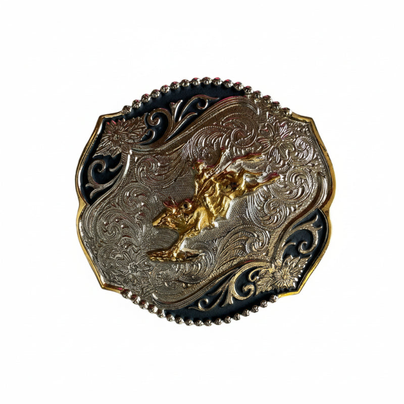 Larger than life that showcases a golden mounted cowboy with arms flailing, dirt flying, and hooves kicking up, all flanked by a highly detailed and textured silvertone area of swirls and serifs, bordered in beads and bars of goldtone, flowers and leaves against a black enamel background. Standard bale on the back.
