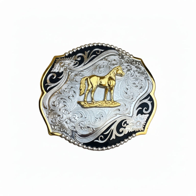 Show your love for equestrian with the gorgeous fashion accessory! This beauty showcases a golden sculpted figurine, flanked by a highly detailed and textured silvertone area of swirls and serifs, bordered in beads and bars of goldtone, flowers and leaves against a black enamel background. Standard bale on the back.