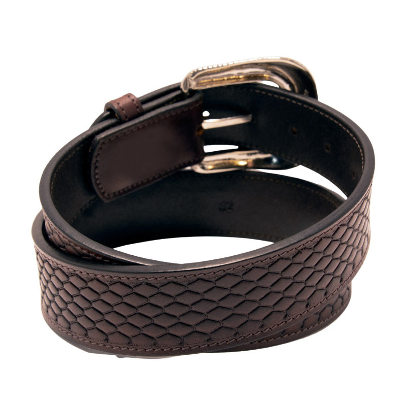 Features a bold, textured rattler-like patterned look, adding a fierce edginess to the classic cowboy or cowgirl styling as well as single stitching that adds strength and durability to the life of the item itself. Crafted from durable, high quality materials offering a polished edge with a sleek dark chocolate finish with eye-catching detailing that's perfect for everyday jeans or for a dressy night on the town. Has a high finish silvertone removable buckle with a rope edge and etched swirls and serifs. Finishes include: 1-1/2 inches wide and 1" between holes. Choose your size from the drop-down menu.