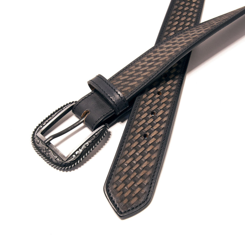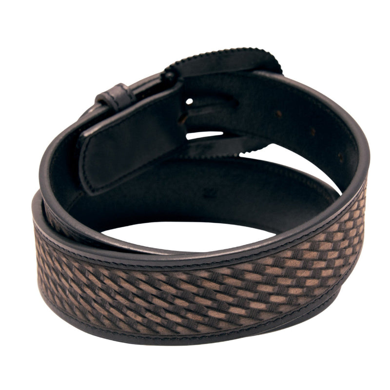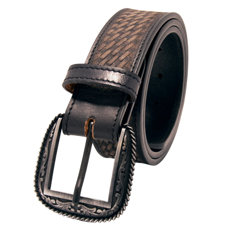 Showcases a detailed woven pattern that adds texture to the classic cowboy or cowgirl styling as well as single stitching that adds strength and durability to the life of the item itself. Crafted from durable, high quality materials offering a polished edge with a sleek ebony background with a rich milk chocolate finish on the raised areas with eye-catching detailing that's perfect for everyday jeans or for a dressy night on the town. This one has a timeless, rugged sophistication. Has a high finish silvertone removable buckle with a rope edge and etched swirls and serifs. Finishes include: 1-1/2 inches wide and 1" between holes. Choose your size from the drop-down menu.