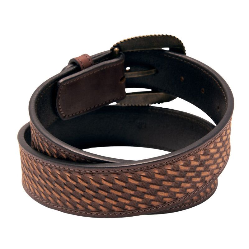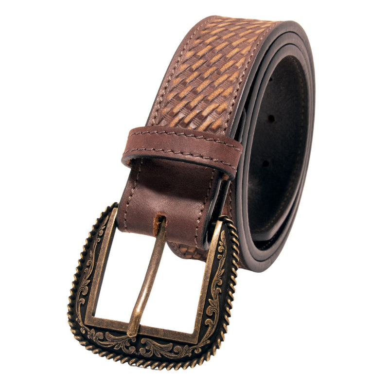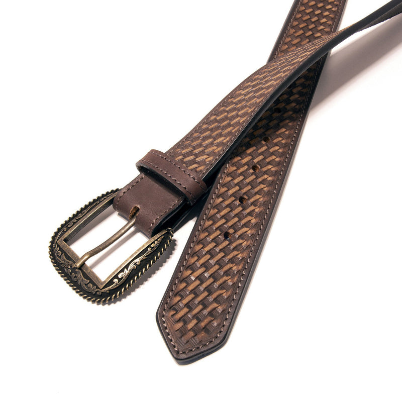 Showcases a detailed woven pattern that adds texture to the classic cowboy or cowgirl styling as well as single stitching that adds strength and durability to the life of the item itself. Crafted from durable, high quality materials offering a polished edge with a creamy milk chocolate background with a rich natural buckskin finish on the raised areas with eye-catching detailing that's perfect for everyday jeans or for a dressy night on the town. This one has a timeless, rugged sophistication. Has a high finish goldtone removable buckle with a rope edge and etched swirls and serifs. Finishes include: 1-1/2 inches wide and 1" between holes. Choose your size from the drop-down menu.