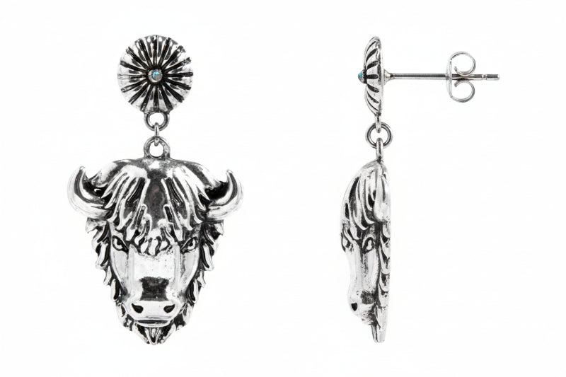 Sport this classic look to your favorite cowgirl outfits with these furry critter-themed bison featuring a silvertone design with engraved details with basic sunburst studs with a tiny iridescent rhinestone studded concho and light-catching horned dangling charms. Lightweight and comfortable with for all day and night wear for the rodeo, a night on the town for all your favorite fashions.